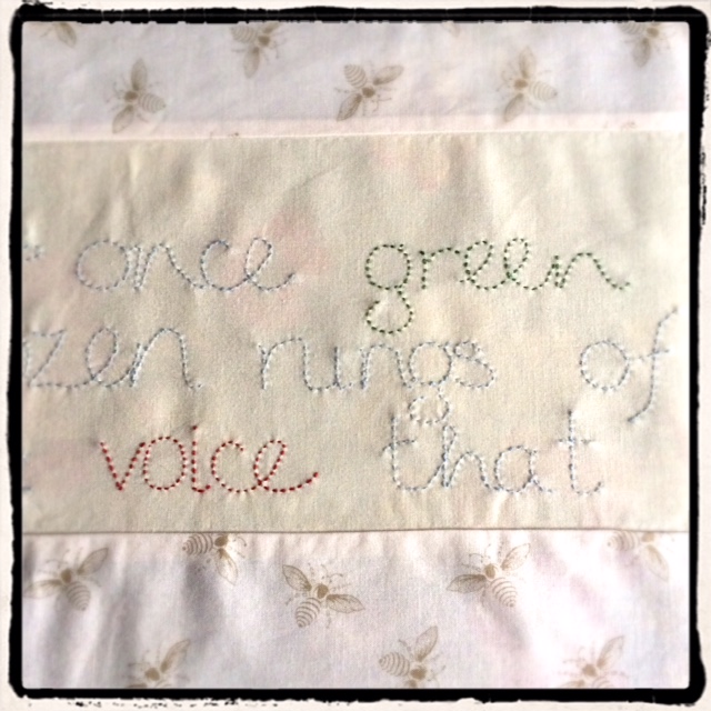 However, it turned out to be a very positive way of quilting. I used the unabridged audiobook (an excellent reading by Alex Jennings) and simply let the needle go where it wanted. My hands turned my listening into stitches that hinted at shards of ice and snow, the melting water of the thaw, a rose ring, green fabric from a velvet coat, primroses, flames, rooks, a joined circle, and the six signs at the centre of the story. I deliberately did not stitch anything figurative, as I wanted an abstract piece that could stand alone in its own right, as well as giving a fleeting impression of Cooper’s prose.